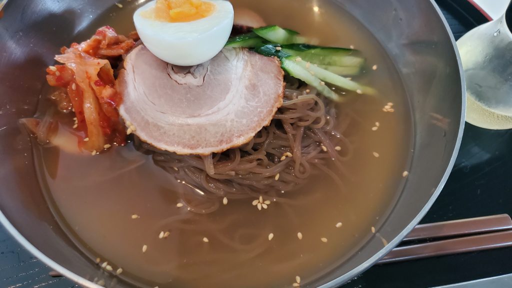 定食のお味噌汁も捨てがたいけど、今日は冷麺の気分。本格的でめちゃくちゃおいしい。やっぱりサウナ後に食べたかったなぁと、食べてる間に10回ぐらい思ったけど、空腹には代えがたい。